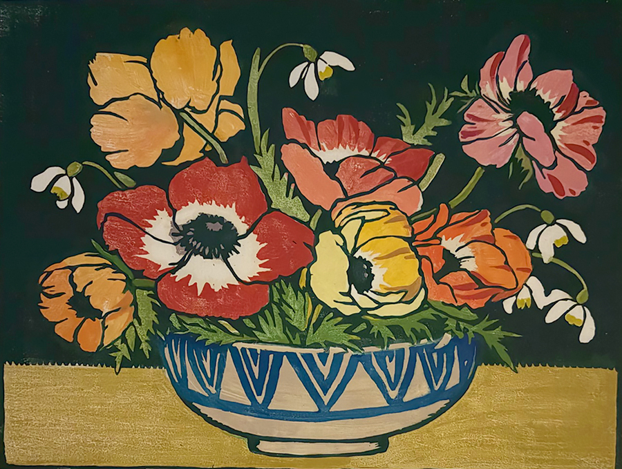 Woodcut printed in colors, circa 1925, from a small edition, perhaps 15 impressions. 9 x 12 in. Signed and titled in pencil. Here we have a superb impression printed on light cream Japanese paper. The margins are full and the condition is fine. This exemplary work is one of several floral prints by Rice. He would often use this dark background, similar to the work of Margaret Patterson, to accentuate the vibrancy of the colors. "During the 1915 Panama Pacific Exposition San Francisco, Rice had a chance to study and absorb the techniques of the Japanese woodcuts that he was to incorporate into his own working knowledge of the medium. In 1918, the first major exhibition of his color woodcuts hung at the California Palace of the Legion of Honor. Though he gained national recognition for his printmaking, Rice embodied the Craftsman spirit, painting with watercolor and oil, and working in ceramics, hammered copper, and woodworking. He authored three books on the subject of block printing, including Block Prints: How to Make Them, and penned articles on naturalist subjects for Sunset Magazine." (from the Annex Galleries website entry for Bert's Iris.) Ex-collection: Reba Williams, New York.
