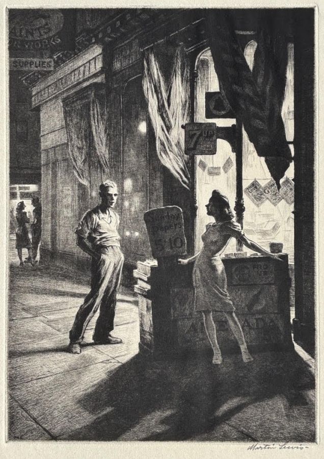 Martin Lewis, Aust.-Amer., (1881-1962) "Chance Meeting", Drypoint, 1941, Pub. by Society of American Etchers, McCarron 131, Ed. 105, 10-1/2 x 7-1/2, signed in pencil, on medium cream laid paper, with full margins, 15-1/2 x 10-3/4, the original glassine hinges at top, a small stray 3/16ths thread like spec of ink to lower right margin, a few minor handling creases, otherwise a rich, pristine impression of this great print by Lewis, with the original portfolio cover, tissue, membership invitation and small typed note signed by John Taylor Arms, all in good condition. As this print is so popular, it is perhaps rare to have the original portfolio cover, which shows some edge wear, and related ephemera, which save for expected small creases to the tissue guard, is pristine.