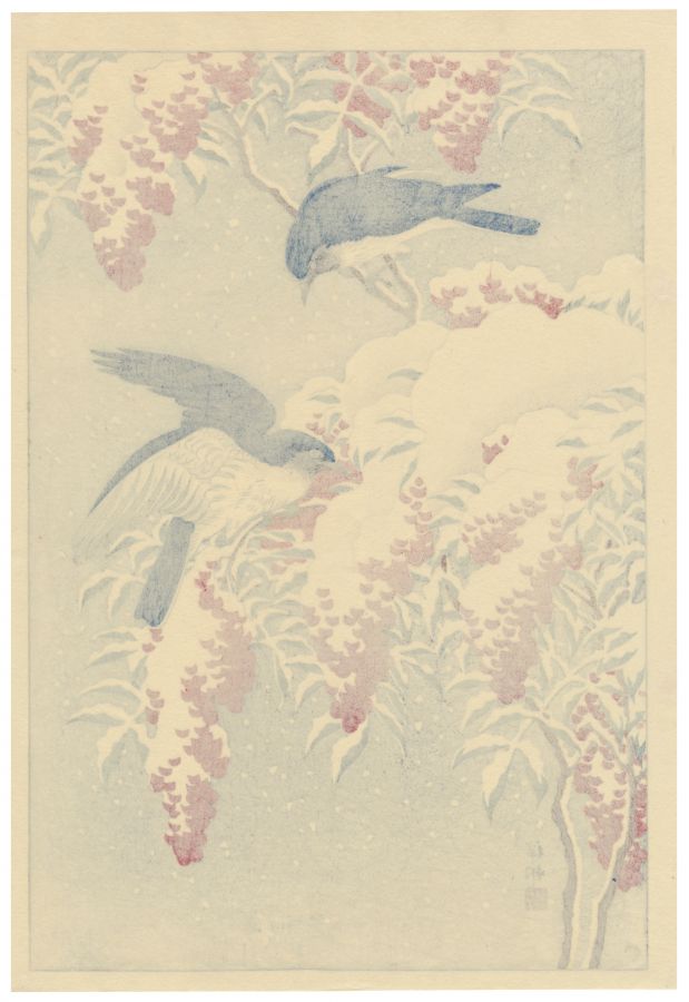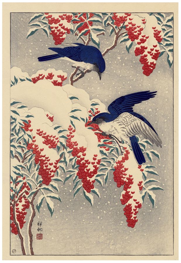 Ohara Koson, Flycatchers On Snow-Covered Nandina, woodblock print, 1929.