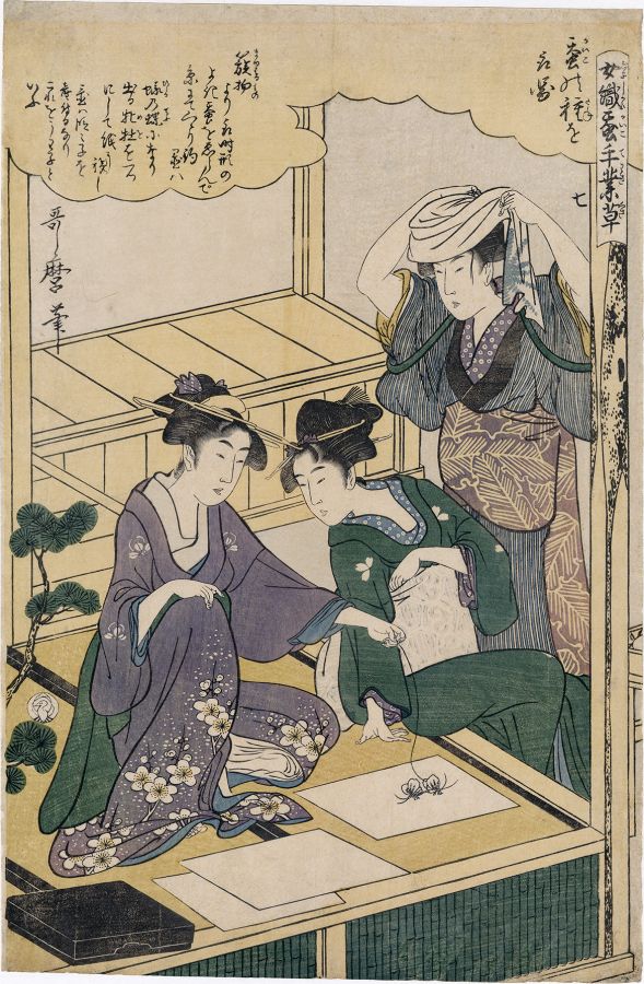 The twelve pictures of this series show the stages in sericulture, silkworm cultivation, traditionally considered the purview of women. The color scheme of this series focuses on purple (in purple picture style murasaki-e), avoiding red. Murasaki-e may be considered a form of benigirai-e, or red-avoiding picture, which enjoyed a brief popularity near 1800. This print, the seventh of the series, shows the stage of the metamorphosis, when the winged moth stage silkworms are used to lay eggs. We see three impossibly elegant women watching two moths be put next to each other on a piece of paper. The text explains the specific stage in more detail. In the cloud-shaped borders, the text describes their activities, which was taken verbatim from the series of twelve chuban prints by Katsukawa Shunshô and Kitao Shigemasa, Kaiko yashinai-gusa. It is thought that these prints were made to help promote the silk industry. The text explains: “From silkworms which are making cocoons, good ones are selected, attached to threads and suspended. Out of cocoons the moth caterpillars emerge. A male and female are put together and moved onto papers. The females lay eggs. This is called uwako(?)”.