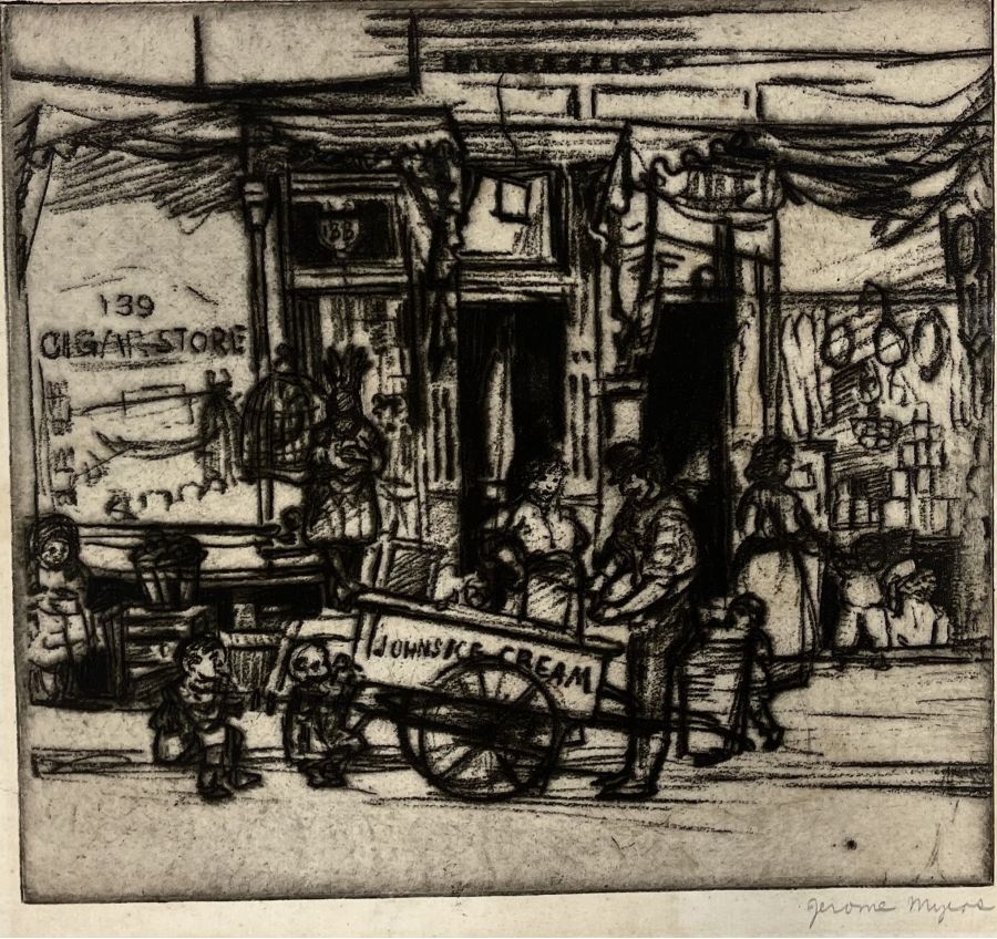 Myers, Jerome (American. 1867-1940). JOHN'S ICE CREAM: Softground etching, not dated. Signed in pencil, lower right. 7 1/4 x 8 1/8 inches (plate), 10 5/8 x 12 inches (sheet). In excellent condition.