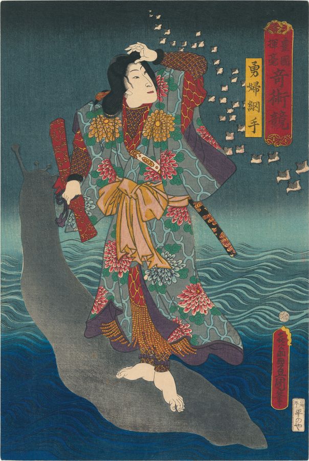 The heroine Yûfu-Tsunade 勇婦綱手(Tsunate-hime), played by the actor Samamura Tanosuke III, employs Slug magic to ride over the sea, checking for any followers behind her. We see plovers rising up behind her. Scene from the kabuki play Jiraiya Goketsu Monogatari, whose story revolves around Jiraiya, master of Frog Magic, and Tsunade, master of Slug Magic. Here Tsunade may be carrying in her right hand the precious sword Namikirimaru, which she and Jiraiya will need to defeat the villainous Orochimaru, master of Snake Magic. First edition works from this series, as here, are prized for their luxurious printing and deluxe paper. Tsunade’s sash and sword hilt feature blindprinting (gauffrage), and there is heavy mica that glitters in the sky and waves. The slug itself features a terrific white-grey lead pigment that adds to its spectral effect.