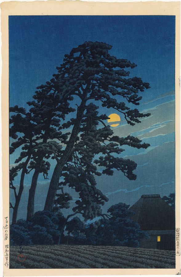 "Moon at Magome," from "Twenty Views of Tokyo". In this masterful evening view, the yellow glow from a small window echoes the haunting presence of the full, yellow moon. This field and straw-thatched village hut have now been replaced by the urban sprawl of Tokyo’s Ota City district. Hasui owned a home in the Nishimagome area, which is also the home of the Ota City Folk Museum, which has held many Hasui exhibitions over the years. This is one of Hasui’s most famous designs, and was chosen for the cover of numerous Japanese catalogs that have been published on the artist. With the Watanabe seal "D", in use between 1932 and 1941.