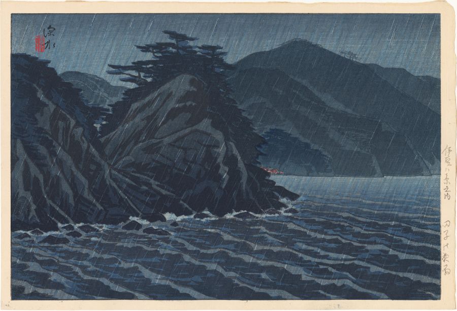 It is a dark and stormy night, the only sign of humanity a small town that is glimpsed as faint lights on the distant shore. Rain falls in grey and white diagonal streaks, and all colors have been muted due to the decreasing daylight. Today there is a beach called Tago-Sebama, and it does feature this steep, rocky terrain topped with pine trees. Tago is located in the area in Nishiizu, which is on the western coast of the Izu Peninsula, a treasured nature area about three hours south of Tokyo. It includes the Izu Peninsula Geopark, designated a UNESCO Global Geopark in 2018. The round Watanabe seal is lower left. This may be considered a first edition, as all museum examples as well as the catalogue raisonné work have this round Watanabe seal.