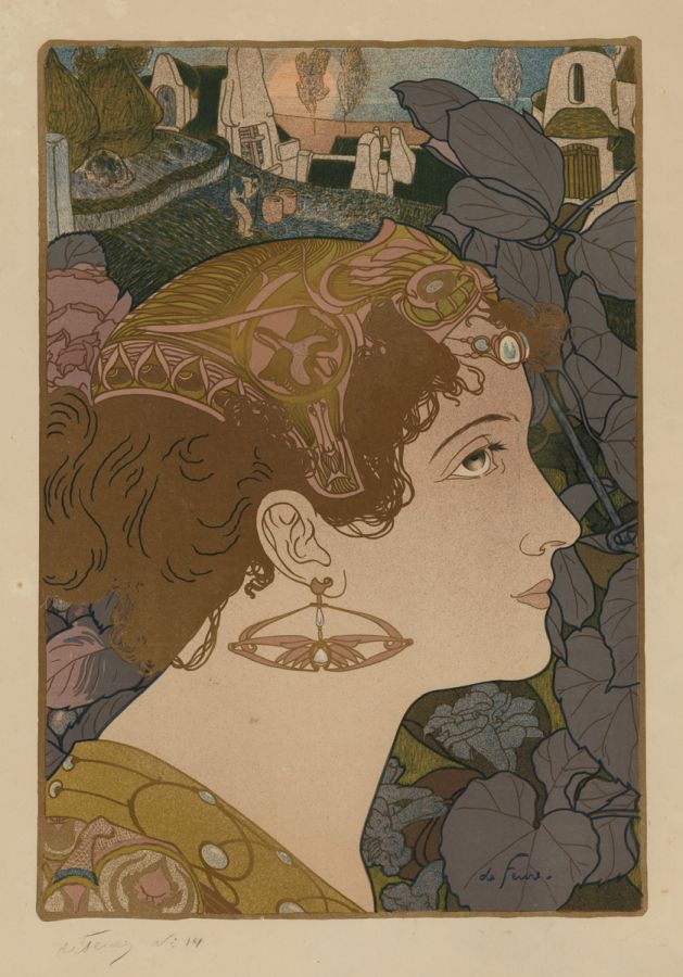 NOTE: This is the most elaborate Art Nouveau color lithograph by the artist which we have ever encountered, and it is in excellent condition. This is also one of the finest example of a fine art print in the Art Nouveau style (as opposed to posters, which are more common).