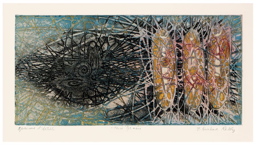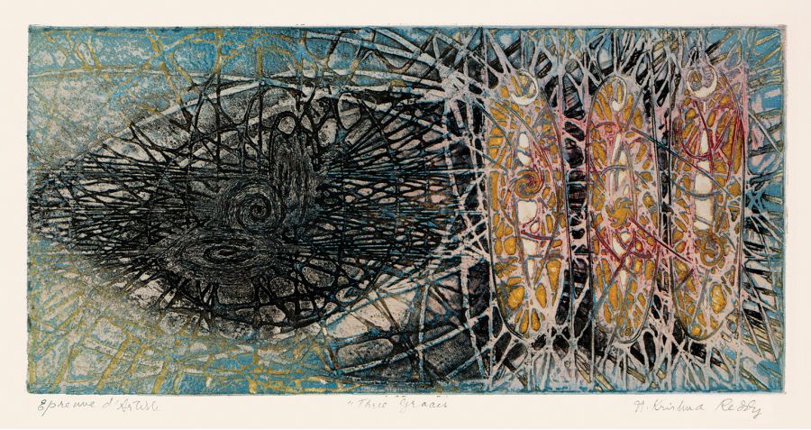 Krishna Reddy, Three Graces, color viscosity intaglio, edition 80 – artist's proof apart from the edition, 1953. Signed, titled and annotated Epreuve d’Artiste in pencil.