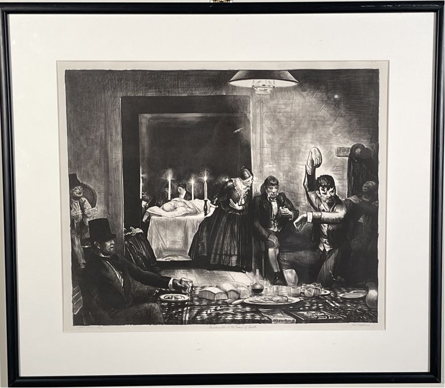 Bellows, George (American 1882-1925). PUNCHINELLO IN THE HOUSE OF DEATH.Mason 151 Lithograph, 1923. Edition of 60. Titled and signed in pencil by Bellows, and also signed "Bolton Brown imp" by the Printer. 16 x 19 1/2 inches (image) 18 3/4 x 25 .inches (sheet). Framed to 18 x 24 inches. In excellent condition. This is one of six lithographs which were used as illustrations for "The Wind Bloweth, a novel by the Irish writer Donn Byrne; a First Edition in Dust Jacket is offered with the print.