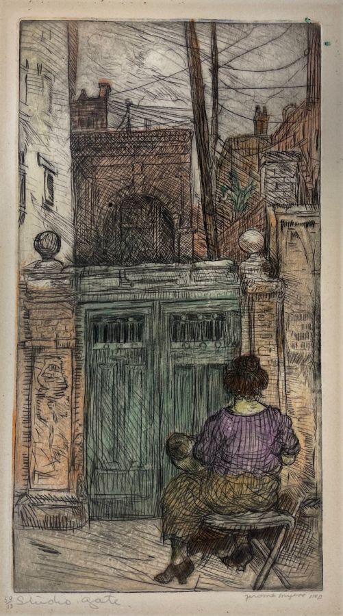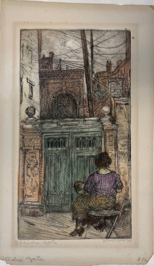 Myers, Jerome. STUDIO GATE Etching with hand coloring, not dated. Edition of 50, titled and numbered 50/13 in pencil, lower left. Signed in pencil, and inscribed "imp" lower right. 9 x 4 7/8 inches (plate), 11 3/4 x 6 3/4 inches (sheet). Tape residue around all the edges, a soft crease, barely perceptible, across the sheet about 1/3 down from the top, mat stain. Still a very beautiful image that will display well.